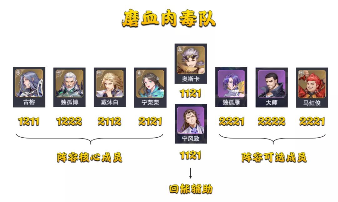 首先是目前版本中最恶心的......也是胜率最高的磨血肉毒队,这个阵容以古榕+独孤博+戴沐白+宁荣荣为核心班底,辅以奥斯卡or宁风致作为回能辅助,最后再挑选一位具备特殊功能的魂师即可完成,并且其中的关键魂师并不用很高的星级便能发挥较大的作用,这也是此阵容为何应用度会如此之广的最大原因所在,接着每位魂师的简要分析如下:
