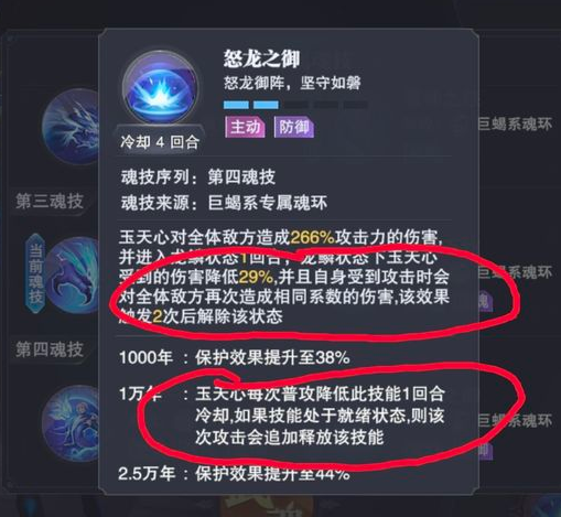 第一回合普攻起手,自动触发第四魂技(1万年魂环),开启怒龙之御后若被敌方魂师打到则会进行反击,2回合内最多反击2次(5万年魂环2回合内可无限反击)