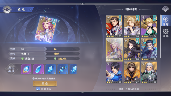 重生可重置魂师等级、称号、资质,并100%返还培养材料,所返还的培养材料将可以自由为其他魂师进行使用。