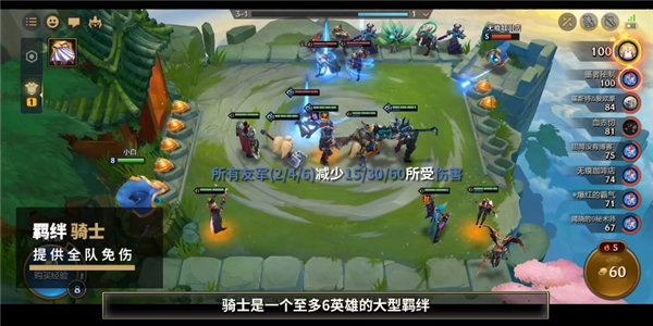 骑士是一个至多6英雄的大型羁绊,效果是为所有友军提供伤害格挡效果,骑士的伤害减免效果受到英雄的抗性影响,如果英雄的护甲或魔抗足够高,甚至可以让敌方的攻击无效。