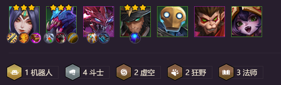 四斗士能抗前排而且有控制配合二虚空羁绊打出真伤,主C法师释放技能完全可以秒人,打刺客阵容极为轻松。
