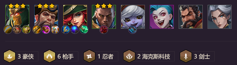 2、阵容分析:3豪侠为金币垫下基础,6枪手开局火力出击,3剑士为前排抗伤,海克斯科技开局降低敌方英雄攻速,更好的拖延敌方输出。