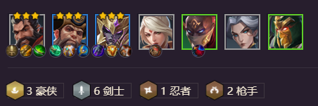 六剑士与二枪手配合太厉害了,其中无畏重炮要用金铲子+反曲之弓合成剑士羁绊,打出爆发伤害。还有3豪侠,不管对战输赢一直给你提供额外金币,为刷牌升级提供一定基础。