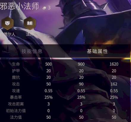 邪恶小法师用魔法能量来轰击随机一名敌人,造成350/650/1350点魔法伤害。如果邪恶小法师的星级高于敌人,那么这个技能会将其立刻击败。