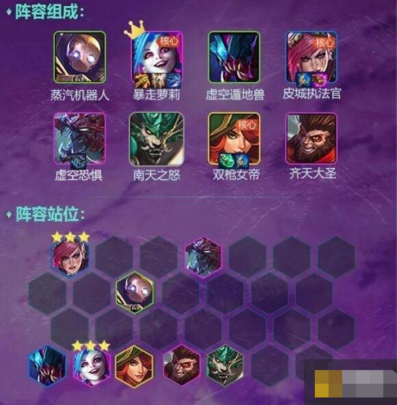 棋子构成站位图从上到下:皮城执法官(蔚)、虚空恐惧(大虫子)、蒸汽机器人、虚空遁地兽(雷克塞)、暴走萝莉(金克斯)、双枪女帝(女枪)、齐天大圣(猴哥)、南天之怒(狼人)。