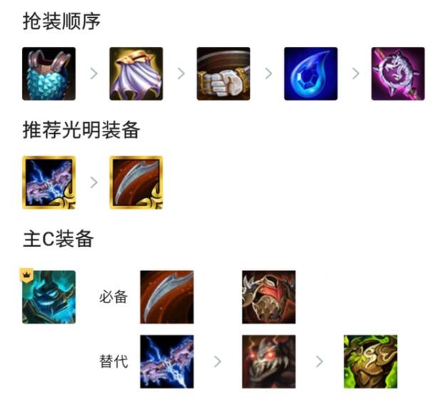 开局的时候,我们优先抢护甲和魔抗,如果没有的话,腰带也眼泪也都是不错的选择,开局的时候,如果有人马,我们可以直接用人马+锤石+波比+克烈进行过渡,猪妹的装备给克烈用,如果猪妹来了就直接上猪妹,只要是阵容体系里面的英雄,来了都可以直接上,这样在有装备的情况下,即使输,我们也不会掉血太多。