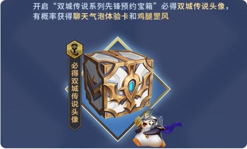 活动:前往官网及掌盟官方平台预约,即得双城传说【先锋预约宝箱】,开启必得双城传说头像,有概率获得聊天气泡体验卡和鸡腿罡风