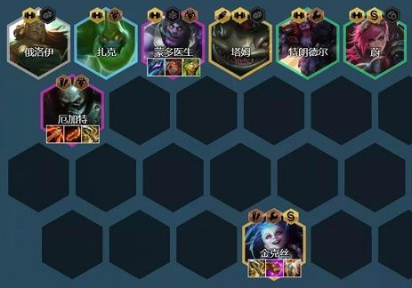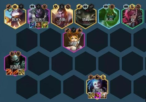 阵容组成:蔚、扎克、厄加特、迦娜、蒙多、厄加特、金克斯、塔姆、猫咪、杰斯(9人口大成阵容)