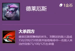 大杀四方:德莱厄斯呈环状挥舞他的斧头,造成200/275/350魔法伤害,没命中一名敌人就会获得125/150/175治疗效果