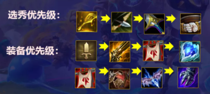 开局装备优先拿腰带,腰带开局才是正确的玩法。前期一定一定要做狂徒铠甲,这个装备是前期盖伦连胜的关键。前期留女警>大嘴,2星女警只要前排够肉的情况下,一把比赛最少能够带走1-2个英雄。