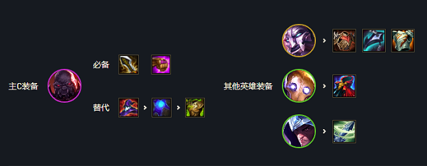 4、装备搭配:【塞恩】正义之手+无尽之刃+珠光护手;【加里奥】荆棘之甲+龙牙+狂徒铠甲。作为社交名流的加里奥自身的回复能力也不错,而3帝国和巨像的塞恩伤害很高,搭配无尽之刃等装备之后进一步提升其爆发力。