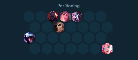 5、站位图:在站位上加里奥和塞恩位于前排,其他的英雄分散站位,主要让对手英雄攻击加里奥和塞恩,这样塞恩就能通过技能打到更多敌方英雄。