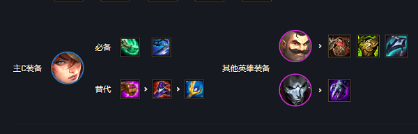 4、装备搭配:【厄运小姐】朔极之矛+巨人杀手;【布隆】荆棘之甲+狂徒铠甲+龙牙。厄运小姐在朔极之矛提供的回蓝能力下可以更快释放技能,搭配巨杀对血量高的英雄的伤害加成,能有更好的技能伤害效果,另外布隆搭配一些吸收伤害提供抗性和血量的装备,支持其在前排吸收更多火力。
