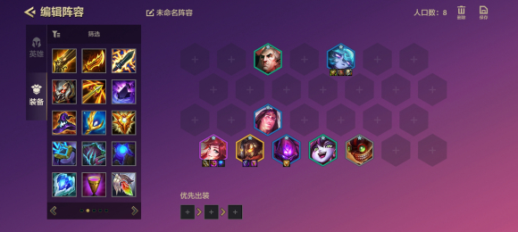 强度确实是有的。接下来我说下我的前期运营阵容。最好是这种开局过渡。约德尔+黑魔法。卡牌先带拉克丝装备。直接合。前期少点血,尽量拉人口。提升战力。我们有约德尔,可以有免费的怪来卖,不差那一两块的