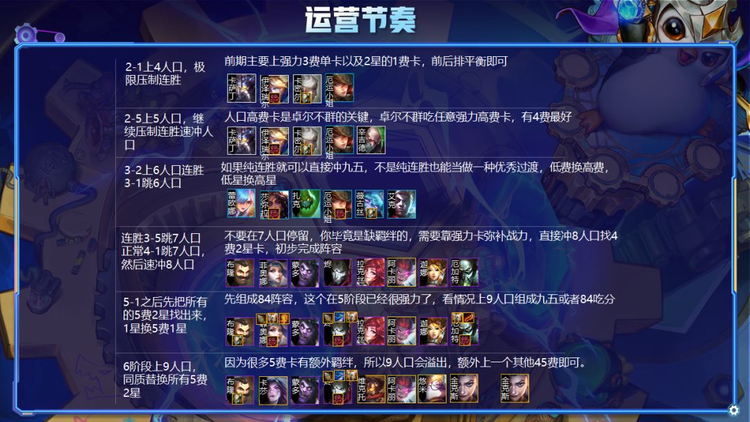 运营节奏主要就是要利用卓尔不群的强力前期速冲人口,最终组成84或者九五阵容,或者最后切换为其他阵容。