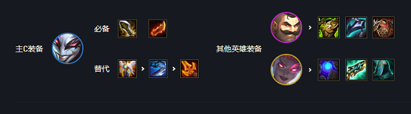 4、装备搭配:【小丑】无尽+羊刀;【布隆】狂徒+龙牙+小反甲。主要的输出就是身为刺客的小丑,在5辛迪加的加成下小丑的坦度也不错,搭配4刺客提供额外暴击能力,无尽有额外的暴击伤害,羊刀让小丑的普攻不断增多,做到快速收割。