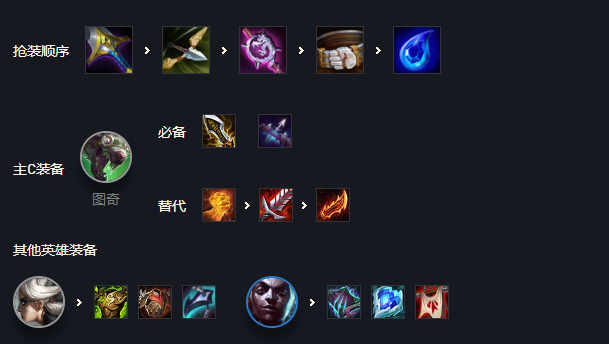 主C图奇:装备给上无尽,正义,轻语备选饮血,羊刀。