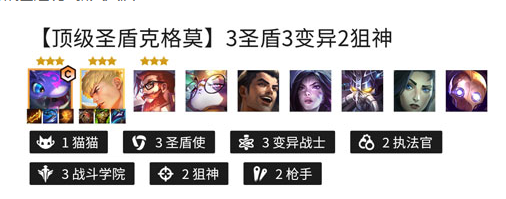 2、羁绊:1猫猫、3圣盾使、3变异战士、2执法官、3战斗学院、2狙神、2枪手