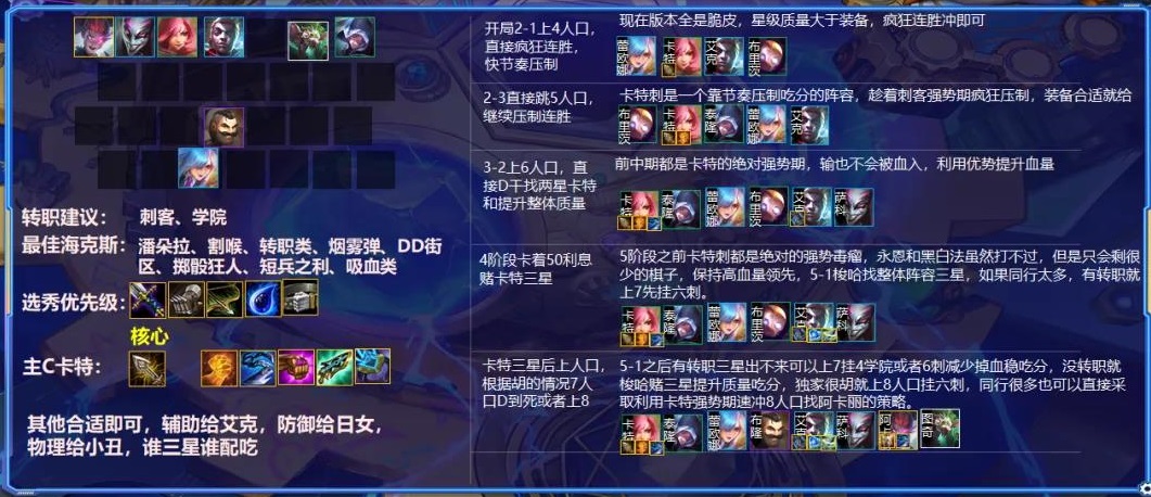 这个版本卡特的强大不是在装备上,而是在于极限压制连胜上,三星才是关键,找吸血海克斯可以不要正义,只要能三星,离子巨杀巨杀都行,千万不要等装备,压制就是一切,所以卡特刺的重点是前期胡卡特,什么装备都能冲。