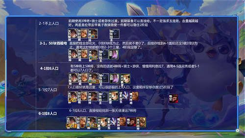4-1如果盖伦三星了,另外剑姬或者VN其中一个也三星了就可以上人口了,就不要继续D了,直接一直卡着利息速冲8人口。