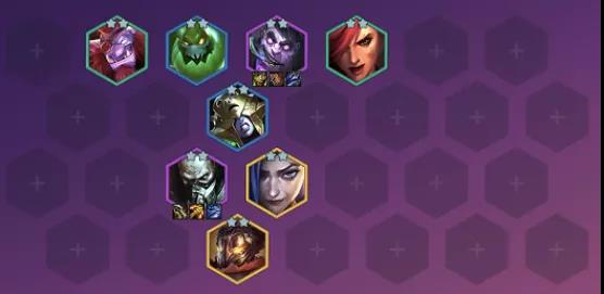 阵容组成:巨魔之王 特朗德尔、皮城执法官 蔚、生化魔人 扎克、冰霜女巫 丽桑卓、祖安狂人 蒙多医生、无畏战车 厄加特(阵容主C)、机械先驱 维克托、暴走萝莉 金克丝