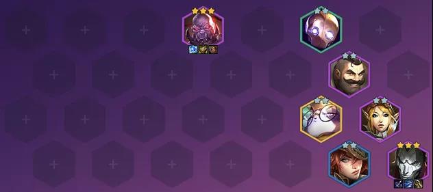 阵容在7人口初步是可以凑出7张卡,这样可以拿4保镖的上张来打。如果4人口能白嫖到赛恩(4)、烬(4)的话就可以直接开始转型。而且玩一些4、5费卡主C的阵容,在海克斯方面的选择要去考虑“高端购物”,这样在8、9人口以后搜高费卡的概率会明显提升,这样搜出3星的高费卡也是比较容易的事。这个阵容要考虑到抢8的节奏,这样对于提升两张阵容的主C是非常容易的。