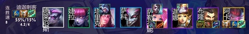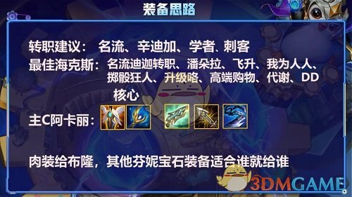 6、站位分析:站位比较简单,主要是后面一堆加阿卡丽奶前排,阿卡丽吃名流圈,但是如果有吹风对位名流圈的话不如不吃,所以这个时候科技枪就比无尽要好用了,靠前排能抗能奶来打。