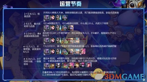 4-1上7人口,不要停留不到D牌,利用前期的血量连胜优势直接速冲8人口,7人口D卡毫无意义,加强后的小丑也是个弱鸡,根本不配吃装备,过渡稳血甚至都不如男刀,7人口挂个名流即可。