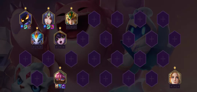 3-5回合仙灵女巫、青丘灵狐、小法师、天雷引、激流之鳞、光元素使,前两回合我们都别D开,赞两波钱,这回合我们再D20金币,留下20金币,保证全员二星以及D出更多的体系卡。站位不变。