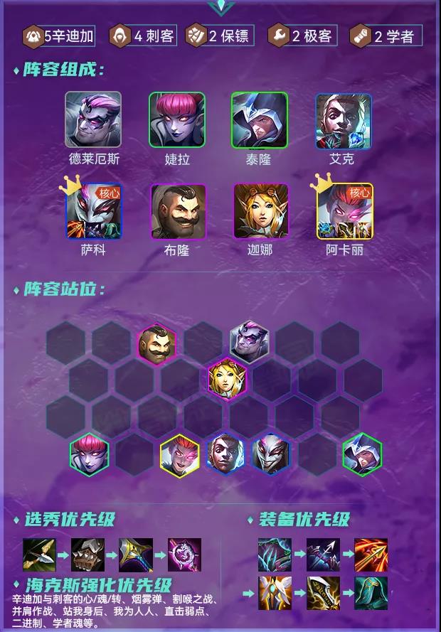 阵容羁绊:5辛迪加 4刺客 2保镖 2极客 2学者