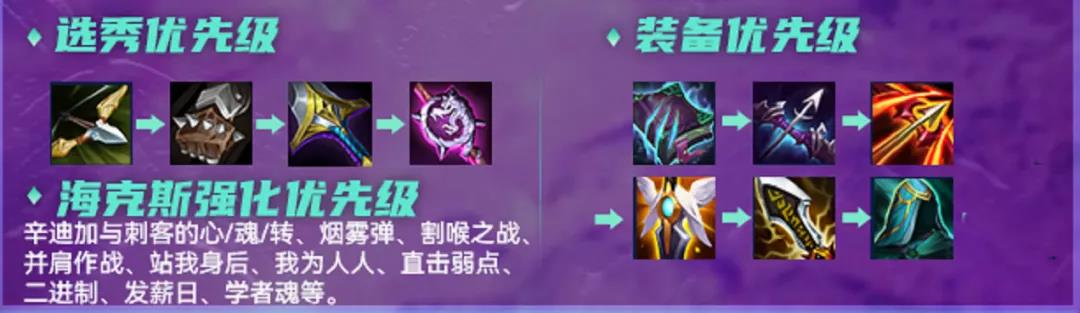 海克斯强化方面最优的就是辛迪加与刺客的心/魂/转、烟雾弹、割喉之战,其他可考虑并肩作战、站我身后、我为人人、直击弱点、二进制、发薪日、学者魂等。