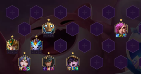 7人口阵容组成:激流之鳞、仙灵女巫、机器人、命运之手、狐狸、光元素使、皮城执法官、驭影双生