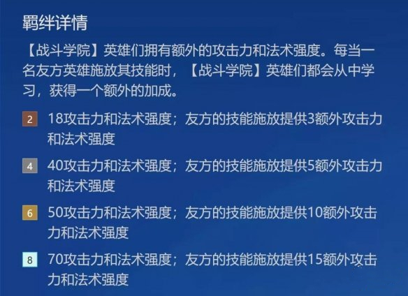 8学院阵容能够让学院阵容开局直接获得70的攻击力和法强,并且每次友方释放技能能够叠加15攻击力与法强,简单的来说如果阵容所有英雄(8人)只要释放一次技能就能够全员获得205攻击力和法强的加成,而只要给卡特琳娜搭配一个蓝BUFF,这个加成则会直接拉满。