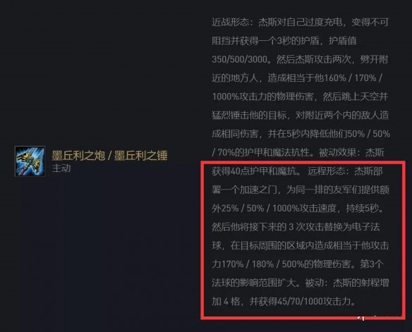 而技能开启还能够获得25%/50%的攻速,第三次伤害还是群体AOE的伤害,总的来说只要能够撑到杰斯开启技能,后续的伤害是能够直接拉满的。