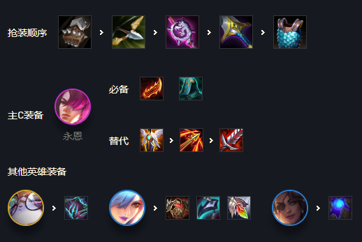 永恩作为阵容核心输出点,装备搭配复活甲保证稳定输出与容错,复活时间分身还能持续输出,再搭配上羊刀,可以将攻速与输出最大化,开大后快速清场,最后可以补充一件水银防止被控。
