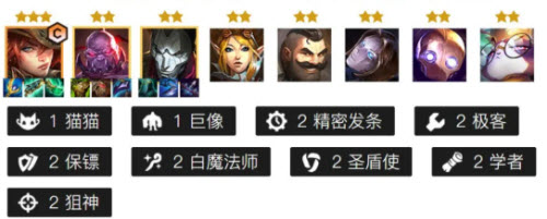 1、阵容搭配:1猫猫1巨像2精密发条2极客2保镖2白魔法师2圣盾使2学者2狙神