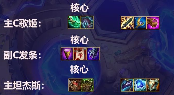 9人口挂什么主要还是看来拍以及溢出的输出装,如果偏法系,可以挂卡莎/把把C当副C,如果偏物理系就养个剑姬,有转职就开7发明家即可。