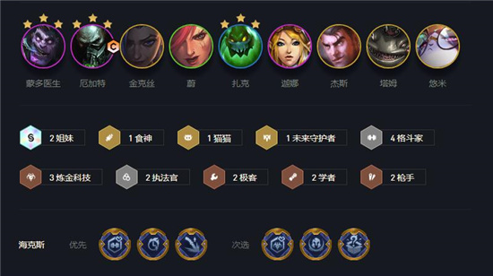 2、羁绊搭配:3炼金科技+2姐妹+2枪手+4格斗家+1猫猫+2学者+2执法官+2极客+1未来守护者