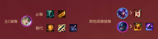 肾坦度高,带肉装前置为后排创造输出环境,永恩前置释放大招后使后排输出最大化。后置位的主输出艾希防止被刺客直接切到,确保安全输出。