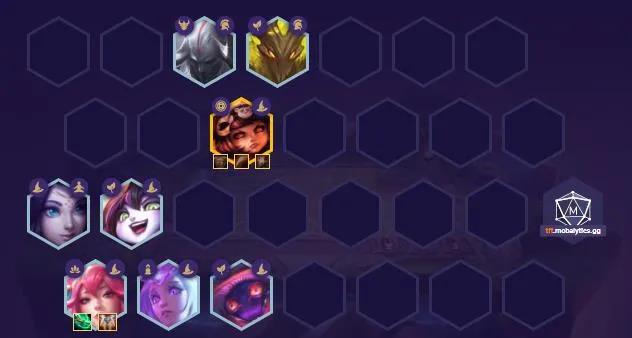 安妮三星以后利息上七,七级攒几波利息直接速八,后期根据对局灵活变阵,如果决赛法术阵容多,下双重换猫咪、时光双秘术,除了加魔抗还增加了续航和复活。