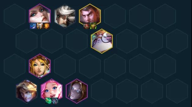 过渡推荐:大头+EZ+炼金+机器人+诺手组成3发明家2极客2保镖,也可以男刀+卡特+诺手+曙光组成2刺客2保镖2学院,5人口上质量卡即可。