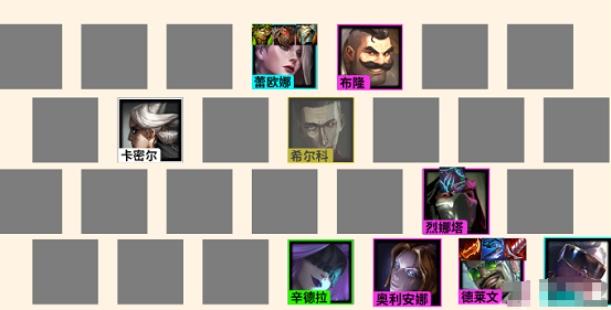 1、阵容组成:卡密尔+辛德拉+蕾欧娜+赛娜+德莱文+布隆+烈娜塔+奥利安娜