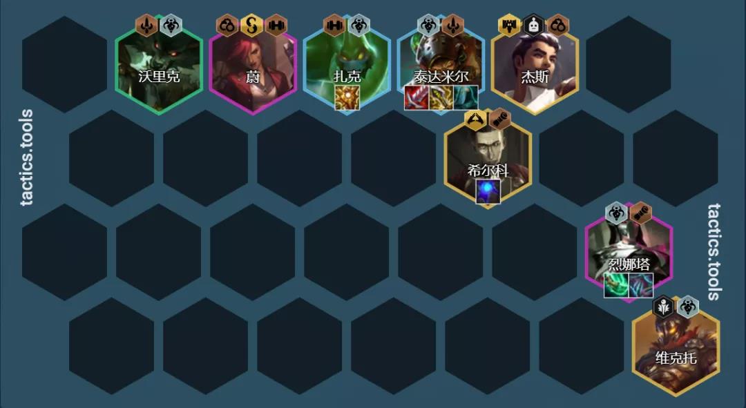后期阵容:8人口替换维克托+杰斯,补充希尔科和杰斯。后期的提升点在于追到3星蛮王和扎克,其次将场上的3张5费卡都追到2星即可成型。因为这是一套赌3费卡的阵容,因此几乎是不可能能够拉9人口的,所以8人口只要将阵容质量提起来后期就能吃了。