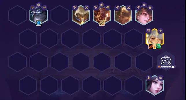 后期升八找盲仔和永恩补全阵容,如果是玉剑天选后期单补永恩凑宗师,基兰换风女也是二玉剑二秘术,基兰复活增加拉克丝容错,三宗师给拉克丝充足的叠加攻速时间。