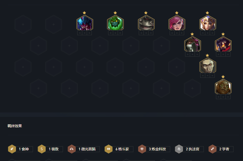 在双城的时候蚂蚱携带鬼书的效果,中期稳血能力非常高,而这套阵容也是差不多。烈娜塔自身技能就携带毒,且还是群体伤害;只要在中期有1星烈娜塔基本就可稳定升级9人口(赌狗对局多的时候,上9不够稳定)。而阵容搭配斗士羁绊,整体提升团队血量上限,这样就能给烈娜塔更多次释放技能的机会。