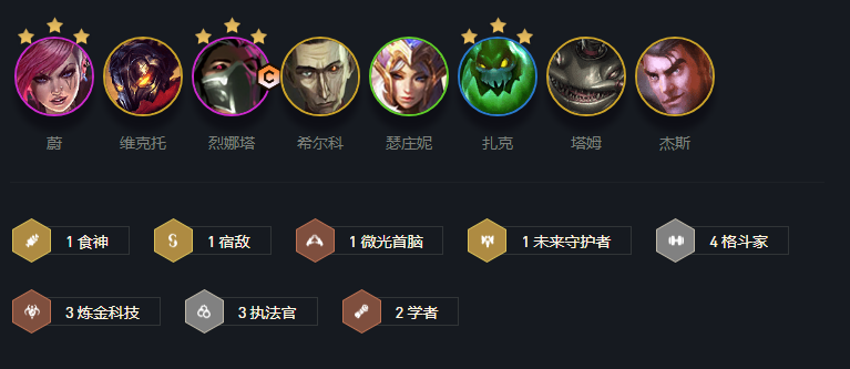 这套阵容需要的橙卡比较多,一般建议直接4-2速八去找橙卡,3阶段只要有4斗+1星神装烈娜塔即可锁血。连败的话,建议3-5选完秀D出4斗3炼金,一星烈娜塔,然后存钱4-2拉八人口,一波D完找橙卡。
