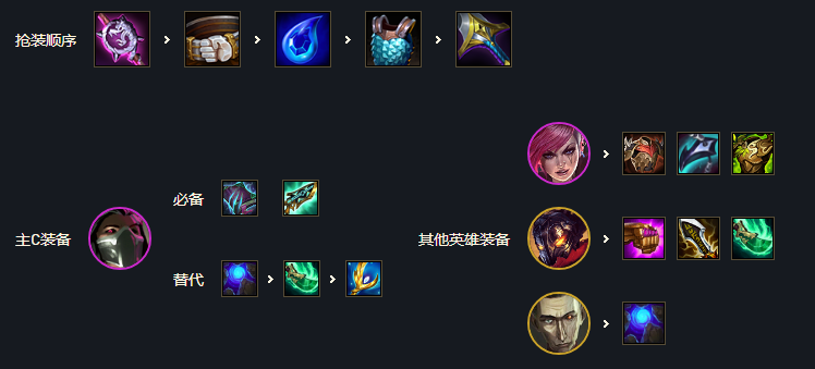 烈娜塔:鬼书,科技枪,蓝buff/青龙刀nn蔚:龙牙,反甲,狂徒/救赎nn维克托:法爆,无尽,青龙刀nn希尔科:蓝BUFF