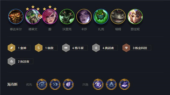 2、羁绊搭配:4格斗家+4挑战者+3炼金科技+2执法官+1宿敌+1食神