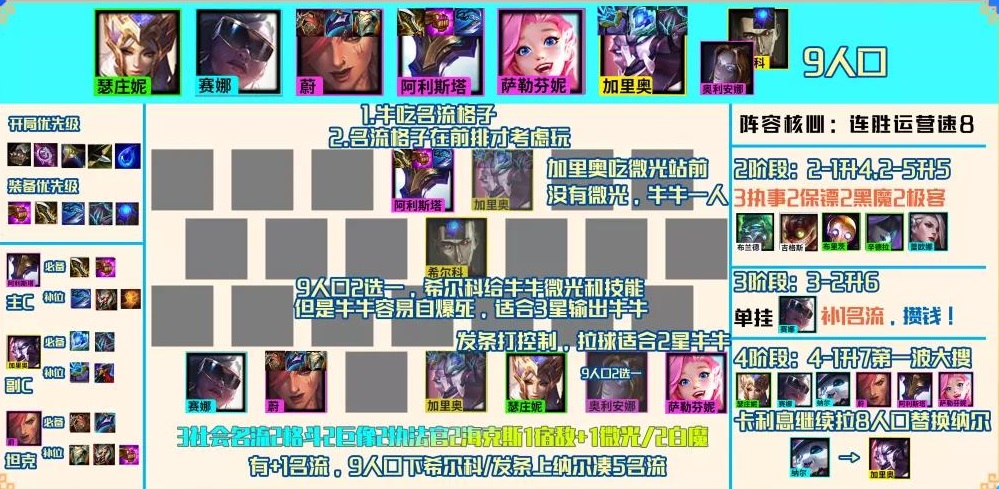 阵容组成:瑟庄妮、赛娜、蔚、牛头、萨勒芬妮、加里奥、发条/希尔科(9人口)