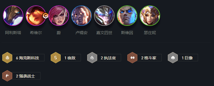 阵容组成:阿利斯塔、希维尔、蔚、卢锡安、嘉文四世、斯维因、瑟庄妮。前期尽量用强势棋子与羁绊打工,保证打工棋子2星,进而稳定血量健康,步入7与8阶段,7与8阶段低费打工卡向以4-5费棋子为核心阵容转型。